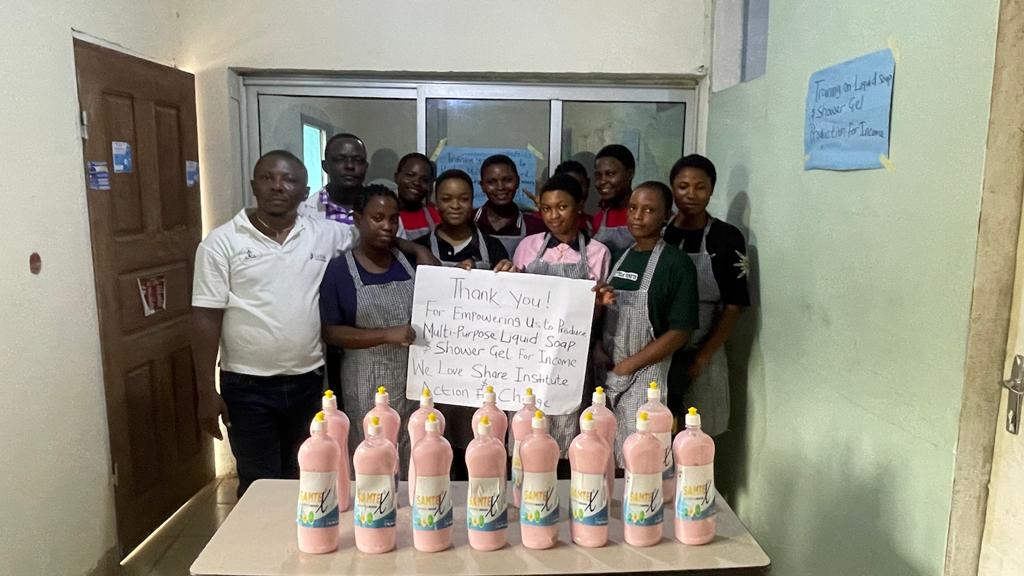 Improving the living conditions of children, women, vulnerable youths and disadvantaged rural and indigenous forest communities of the South West and North West Region of Cameroon remain one of our top priorities. AFC continues to empower vulnerable young girls and single mothers to be self-reliant. This time was in Kombo village Buea where vulnerable young girls and women were trained to produce multipurpose liquid soap and shower gel for money.